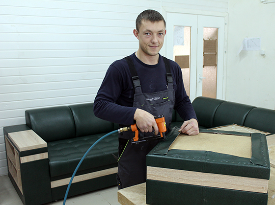 На участке обивки мебели занят Александр Беляков. Молодой человек, равно как и его коллеги по цеху, работает с отдачей, качественно. Ортопедические блоки, а также высокоэластичный пенополиуретан обладают высокой стойкостью к износу.